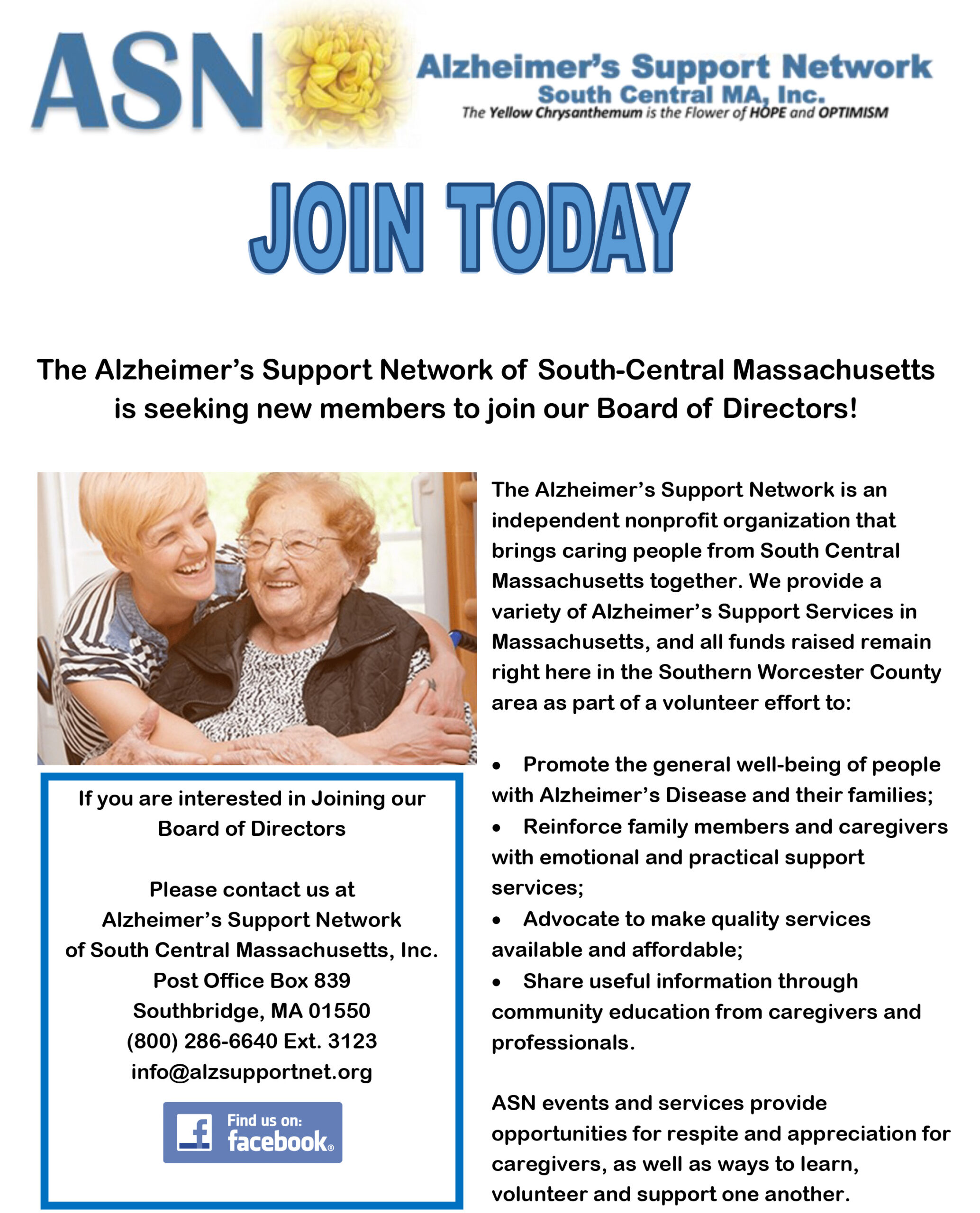 The Alzheimer's Support Network of South Central Massachusetts is an independent non-profit organization that provides support for people with Alzheimer's Disease and their caregivers. We work in partnership with health care organizations, hospitals and professionals to offer early diagnosis, care and resources. All funds raised remain here in the Southern Worcester County and Northeast Connecticut area.